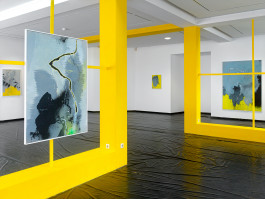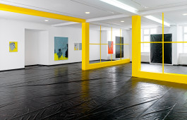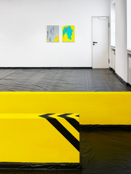 Max Schulze is fascinated by the apparent absurdity of a planning effort without any clear objective, and he relates this to his own exploration of painting. He doesn’t leave the space of the museum alone as a pure repository for his paintings, but stages it in carefully chosen ways in order to activate it as an expansion of painting’s legibility. With yellow columns and the installation of lattice walls, Max Schulze formally intervenes formally in the spaces of the museum. The paintings themselves, by being placed within the inserted elements as well as by dint of their palette, come to resemble danger- or street-signs and are used to organize the space and its visitors. These interventions function as a warning and leave the viewer with more questions than answers. The black plastic sheeting that covers the entire floor of the exhibition site makes the museum’s homey wooden floor invisible and thus heightens the artificial atmosphere of the staging. Yet despite all this transformation of the exhibition space, it is clear that this is not an installation in the classical sense. Rather, the architectural interventions create a new platform for the staging of painting.